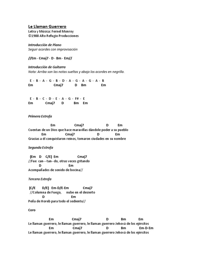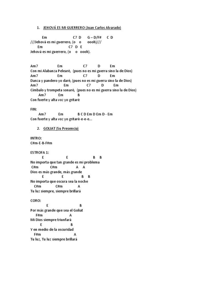 Acordes de Guerrero Es Jehová para ukelele. Y con mi alabanza pelearé Pues no es mi guerra sino la de Dios. Jehová es mi Guerrero Oh oh oh oh Jehová es mi Guerrero Oh oh oh oh Jehová es mi Guerrero Oh oh oh oh Jehová es mi Guerrero Oh oh oh oh Y con mi alabanza pelearé Pues no es mi guerra sino la de Dios. Letra de Guerrero es Jehová. Juan Carlos Alvarado - Jehova Es Mi Guerrero Letras y canción para escuchar - Jehova es mi guerreroohohoh Con mi alabanza pelearé Pues no es mi guerra si no la de Dios Danza y pandero yo daré Pues no es mi guerra si no la. Y con mi Alabanza Pelearé pues no es mi guerra sino la de Dios con danza y pandero yo daré pues no es mi guerra sino la de Dios címbalo y trompeta sonaré pues no es mi guerra sino la de Dios con fuerte y alta voz yo. Acordes de Guerrero Es Jehová para ukelele.