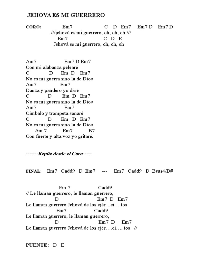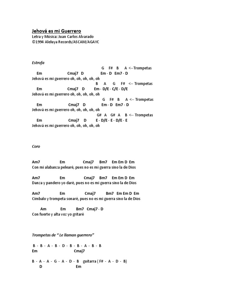 Tradução da letra da música Jehová Es Mi Guerrero de Marcos Witt - Jeová é meu guerreiro Oh oh oh oh Jeová é meu guerreiro Oh oh oh oh Jeová é meu guerreiro. Para versión Original Am poner CAPO 5 TrasteO pueden. JehovÁ es mi guerrero oh oh oh _____ em c d e jehovÁ es mi guerrero oh oh oh am em con mi alabanza pelearÉ c bm em no es mi guerra sino la de dios am em danza y pandero yo darÉ c bm em no es mi guerra sino la de dios am em cÍmbalo y trompeta sonarÉ c bm em no es mi guerra sino la de dios am em b7 con fuerte y alta voz yo gritarÉ.