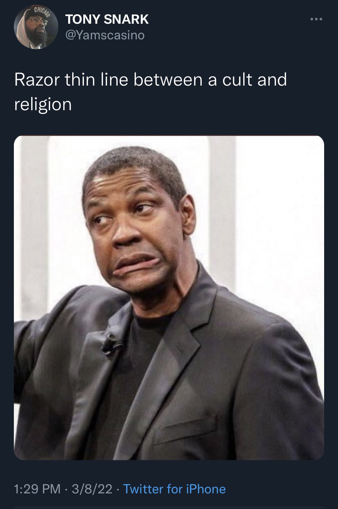 I wish the cast and fans would stop saying cult and thinking like Heavens Gate shit. A man wakes up to a gorilla being in his roof. Sometimes you can get very confused about whether you can consider a religious group as a cult or not.
